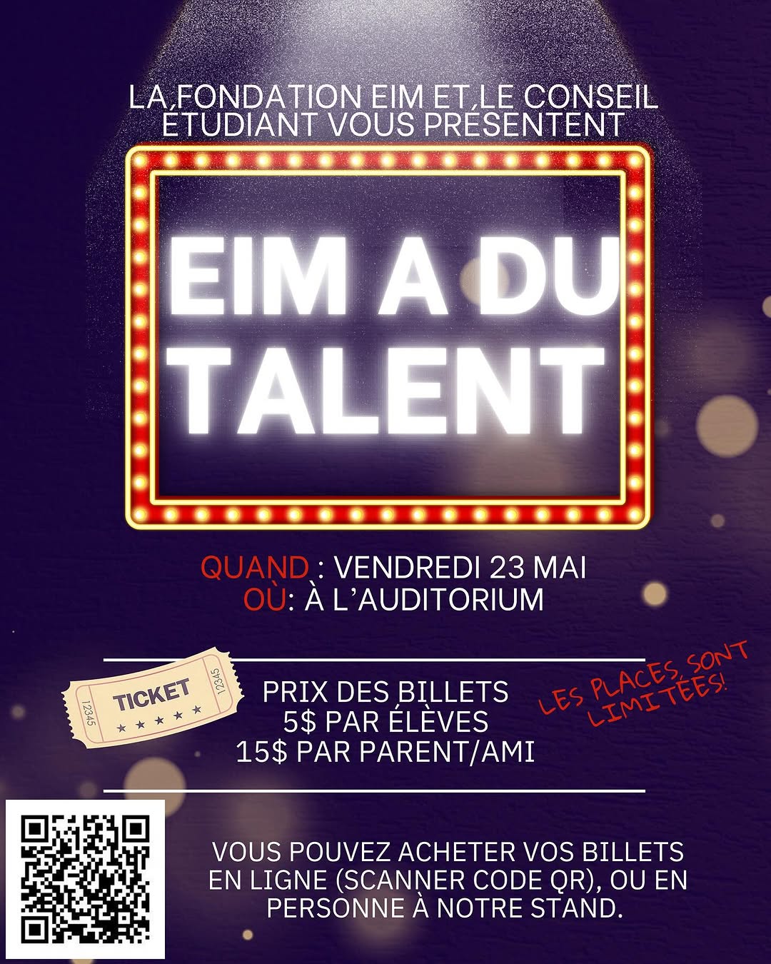 le plus vite possible en ligne sur la plateforme Zeffy : https://www.zeffy.com/en-CA/ticketing/talent-show-eim-a-dutalent